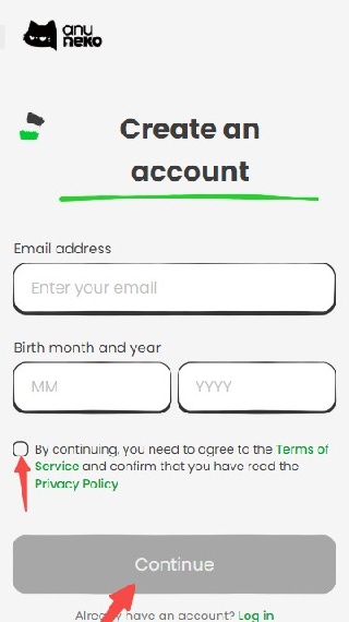 2、填入电子邮箱和出生日期、勾选同意条款后点击底部Continue
