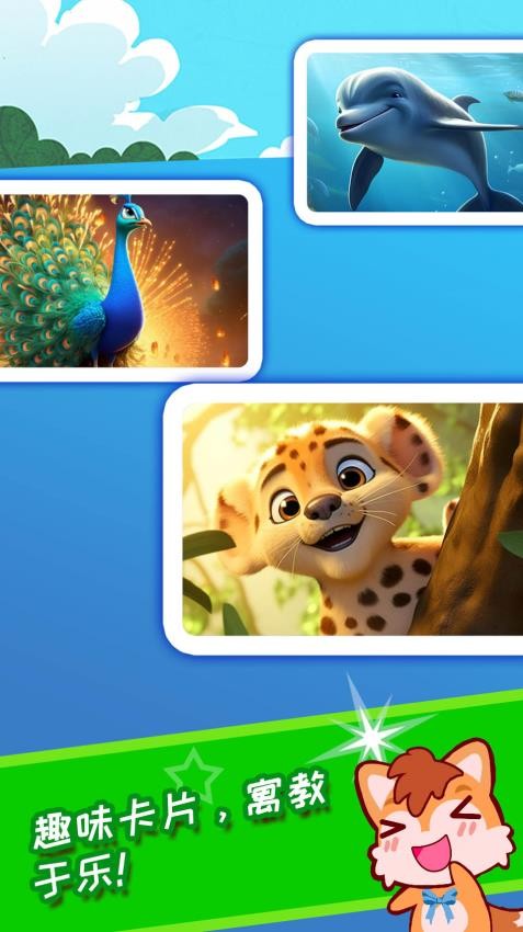 宝宝的图片素养是为宝宝设计的,宝宝看图片和识字,识别常见的动物,食物,交通,风景等。其中,动物和一些景区车辆都有声音,每张图片都有中英文和它的发音如下。还有一些有趣的声音和图片,一个小游戏来测试宝宝的学习效果,宝宝会喜欢它。