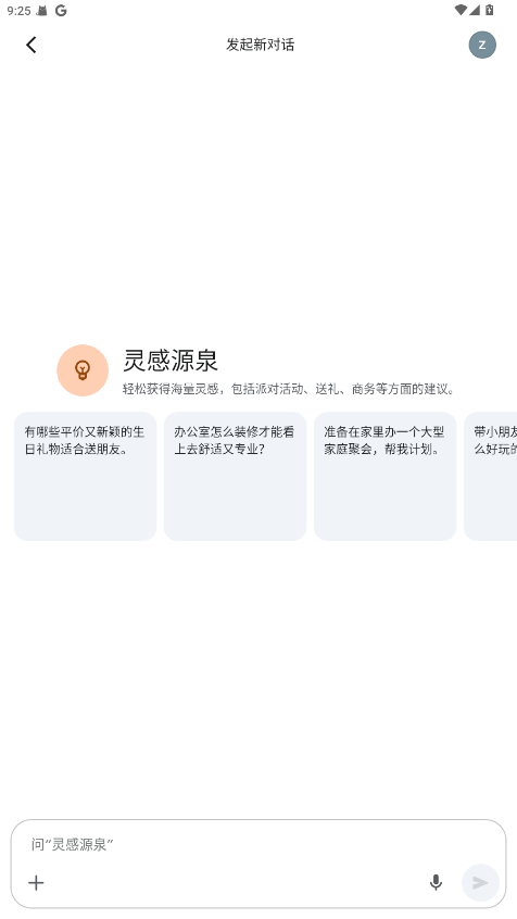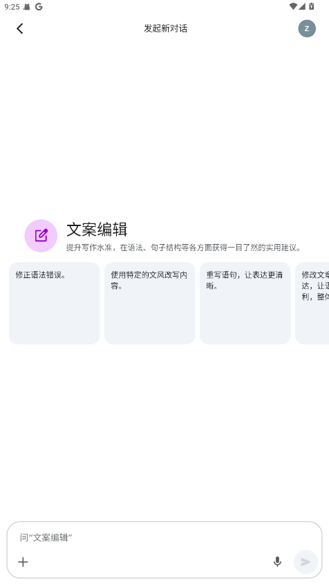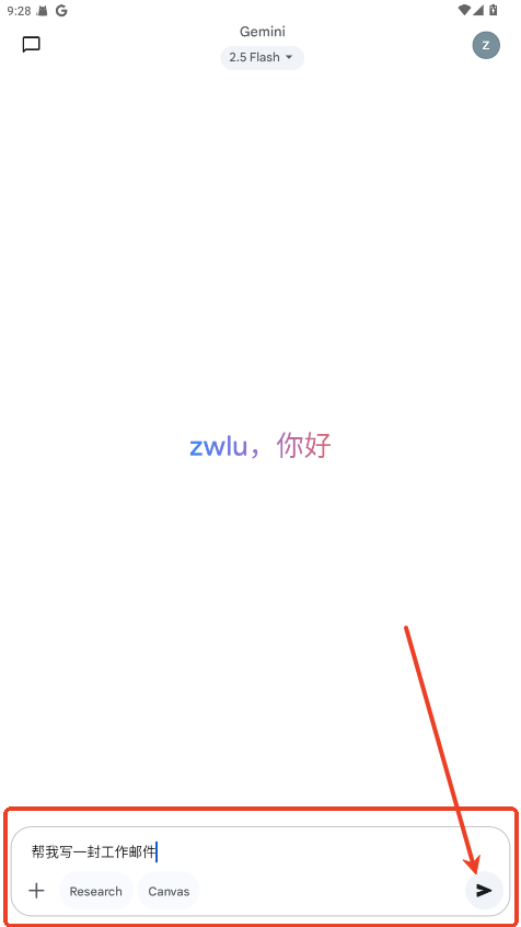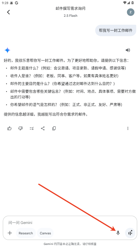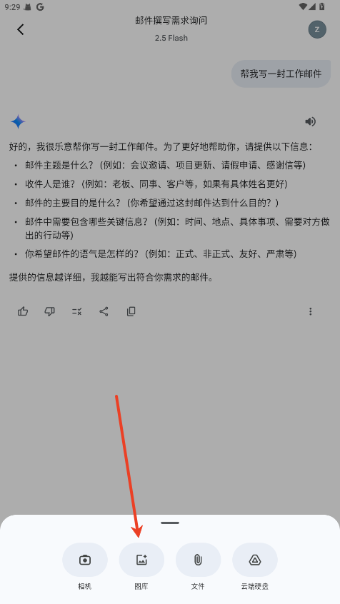 输入文字:直接键入问题或请求,例如“帮我写一封工作邮件”。