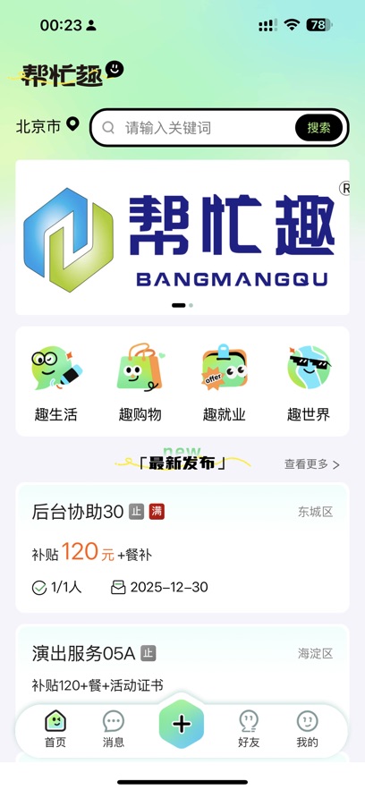 帮忙趣平台官方下载是廊坊市灵工科技有限公司倾情推出的一款涵盖了灵活就业和生活服务的综合平台,平台拥有首页,消息,发布,好友,我的等板块,可以给予用户更棒的兼职体验,下载帮忙趣,更有趣,更有爱,更有你。