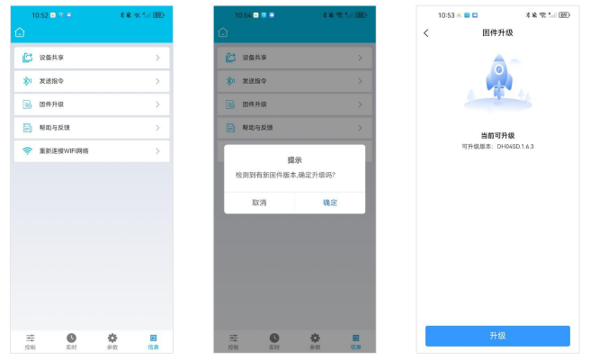 当检测到有可升级固件时,实时页、信息页,都会弹出检测到新固件的提示信息。
