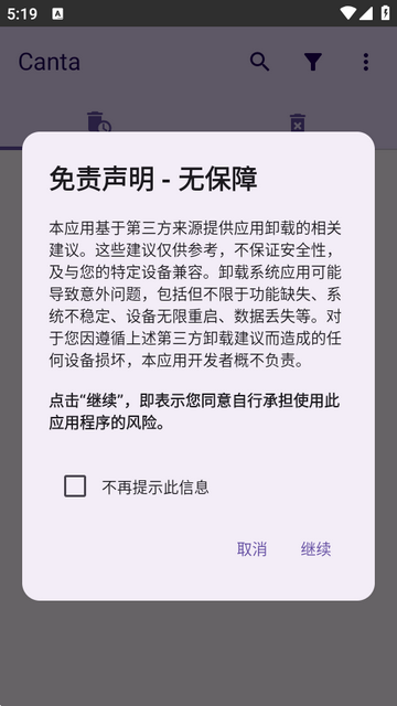Canta软件是一款无root卸载神器,彻底释放你的手机空间。除了基础卸载功能,Canta还提供多项实用特性,详细的应用信息展示占用空间、安装日期等,帮你判断哪些应用值得保留;支持冻结暂时不用的应用,减少后台耗电;内置应用备份功能,重要程序卸载前可先备份。无论是想卸载运营商预装软件的新手,还是追求极致精简的极客用户,Canta都能满足你的需求,让你的安卓设备重获新生,运行如飞。