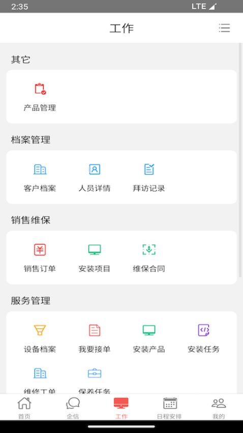 4、进入工作板块,即可进行日常管理和销售维保工作