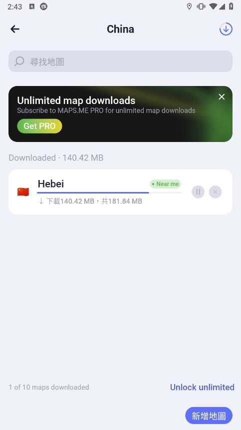 之后下载你当前所在地图的离线地图,也可以下载国内其他地区以及其他国家的地图。