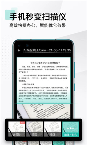 手机拍纸质文档,智能去除杂乱背景,生成高清JPEG、PDF文件。默认自动扫描,对准纸质文档自动拍照,解放双手。