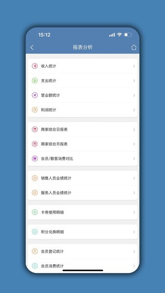 收入统计,利润统计,支出统计,日报月报,绩效提成,消费排行,充值排行,余额排行,积分排行,余次排行,销量排行,库存排行...