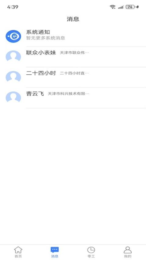 用户可以在消息中心查看到与企业人事的历史聊天消息以及系统通知消息。