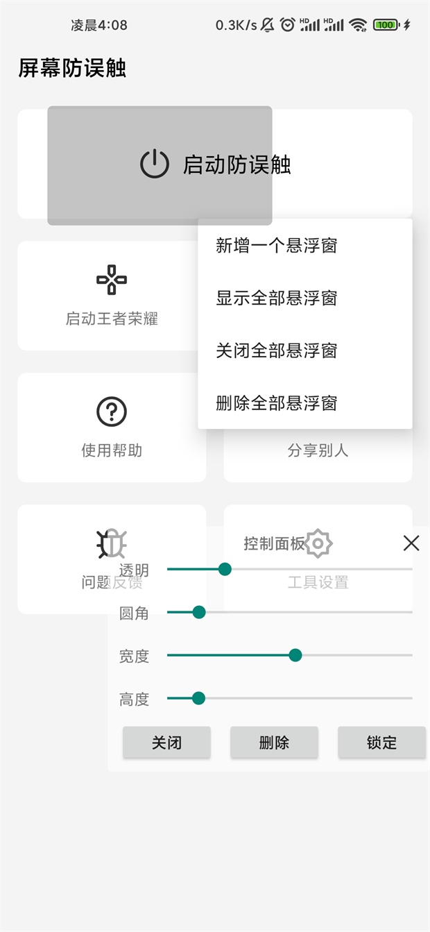 能够支持用户自定义悬浮窗来遮挡误触区域,在游戏或其他场景中屏蔽易误触区域。