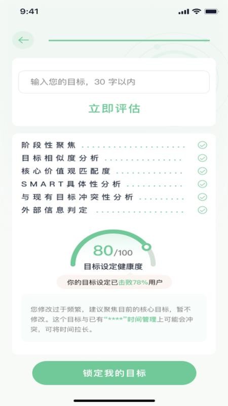 这是通过AI+算法评估你的目标设置是否科学合理的综合评分(0-100分)。它从6个维度分析: