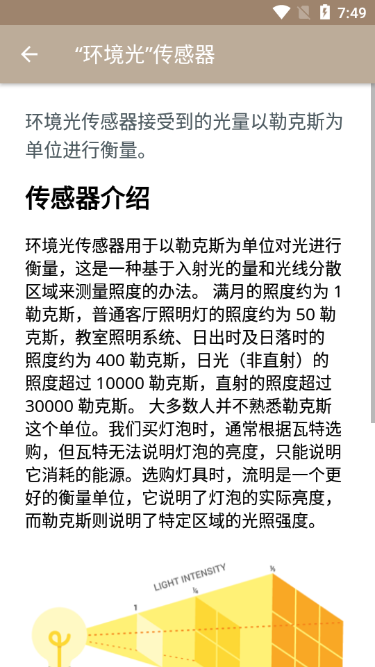 切换类型:左右滑动可以选择不同的内置传感器,如光力计(Lux)、加速度计(X/Y/Z轴)、线性加速度、气压计或罗盘。