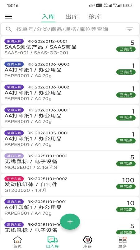 3、在出入库页面就能添加保存入库、出入和移库等信息,便于阅览;