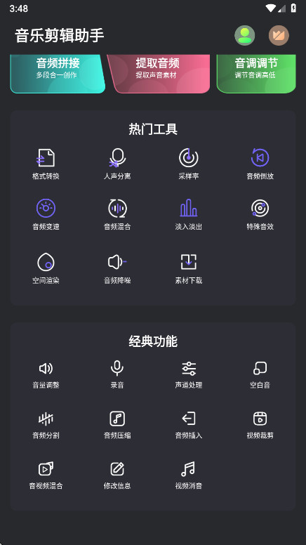 音乐剪辑助手是一款超全面的音频编辑剪辑软件。能对多种格式音频文件编辑,支持自定义裁剪、多音频混合、淡入淡出、音速变身、人声分离、倒放等众多功能。操作方式简单,零基础用户也能快速上手。具备音频剪切、混合、合并、格式转换、提取等特色功能,还能设定铃声、即时录音。可实现淡入淡出、调速变速、变声、音量调节、文字转语音等操作,能满足大多数用户日常音频处理需求。