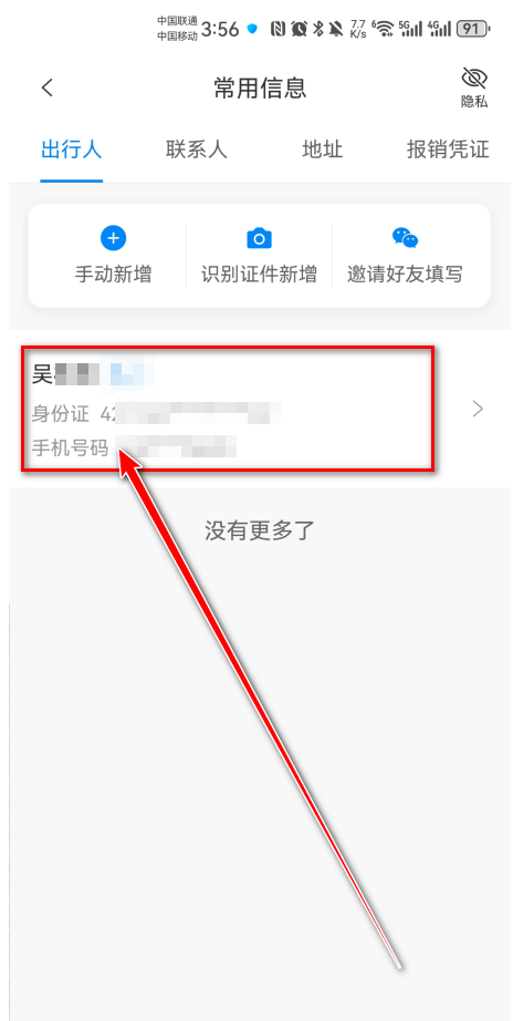 3.点击进入需要删除的乘坐人信息。