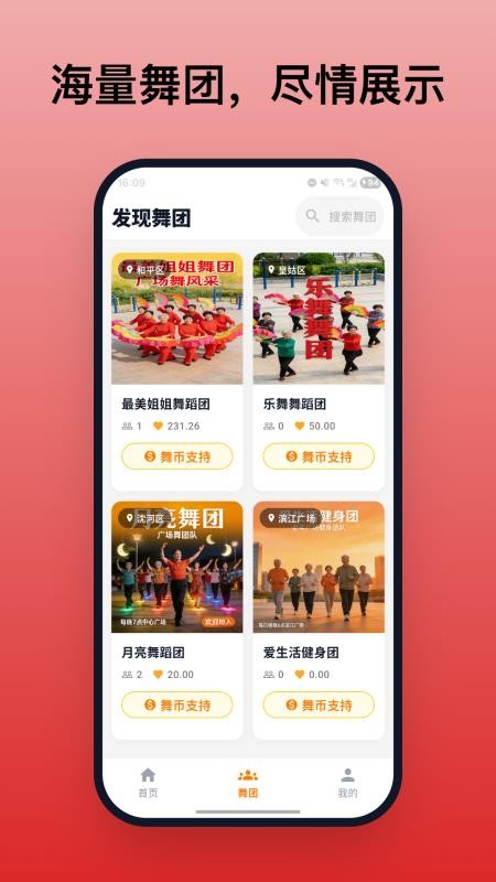 1、在这里就可以查看平台提供的舞团信息了,可以查看不同舞团的资料;