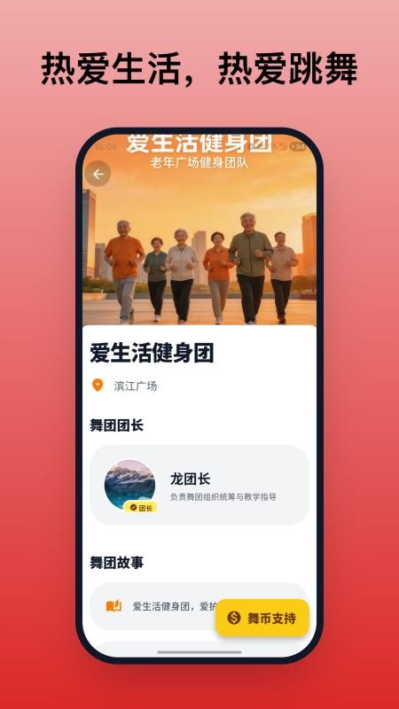 乐舞会app让许多的广场舞爱好者都可以在这里发现更多的活动,以后就可以随时报名参与,这样既可以打破地域限制,让不同地区广场舞爱好者、广场舞舞团在线进行PK,通过PK才可以不断提升广场舞基础,而且还可以帮助舞团实现更便捷的在线管理,以后就可以管理好自己的舞团了!