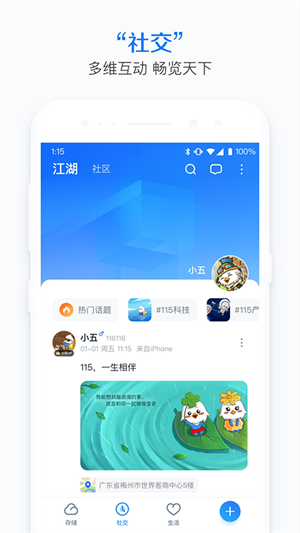 115网盘极速版是由广东一一五科技股份有限公司官方推出了一款网盘软件,软件十分安全稳定、高效智能,能与用户相伴一生。软件不仅可以帮助客户保存海量的信息文件,还可以支持数据多端连接同步,文件随存快取等功能需求,还可以给免费给用户们提供云空间。让用户们能够轻松管理自己的数据。