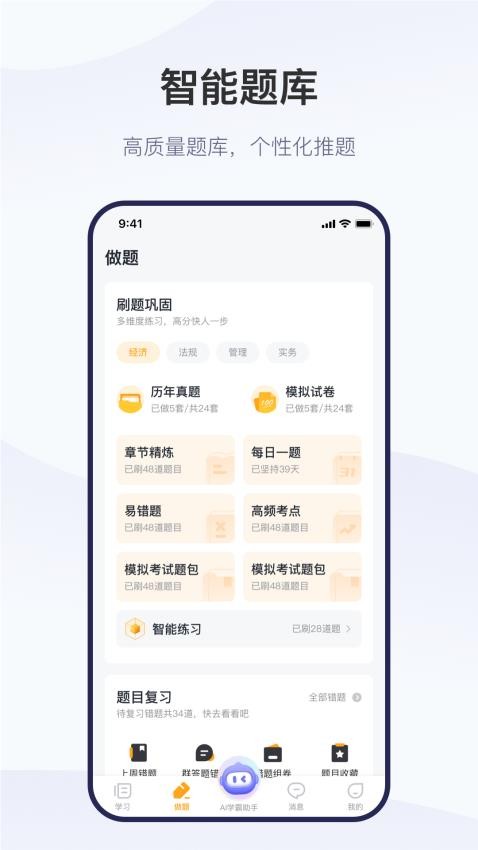 量身定制的学习计划:根据自身情况量身定制专属于你的学习计划,将学习计划以任务的形式呈现,帮你充分利用碎片化时间,分分钟提高你的学习效率。祝你高效拿下考试。