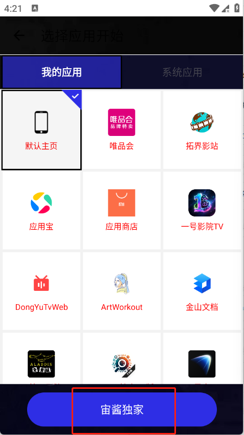 4、选择点击的应用程序包,并点“宙酱独家”。