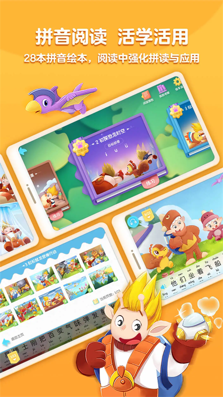 为每个拼音独家定制朗朗上口的原创儿歌,强化理解音形记忆,让孩子有效区分拼音与英文字母。