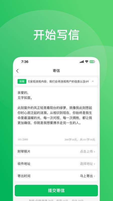 2、用户可以根据自己的需求选择需要的服务功能,例如:选择“开始寄信”;