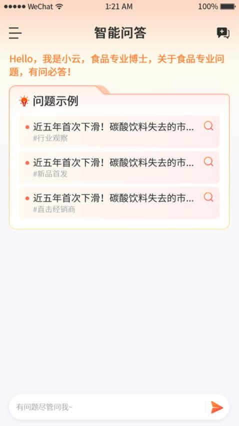 4、可以随时向软件提出食品行业的问题,软件会又问必答;