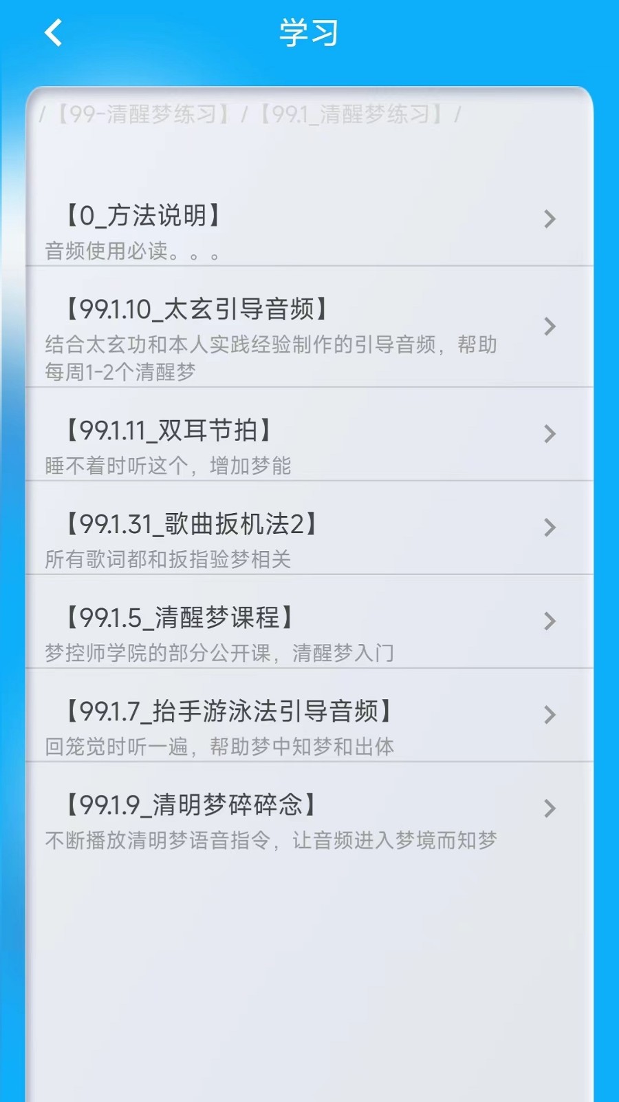 本app集成了清醒梦入门音频课程,提供了清醒梦知梦闹钟、出体闹钟,能帮助练习者每周两次以上的清醒梦。