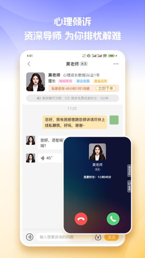 在应用中就能倾诉咨询,咨询师实时在线给你答复;