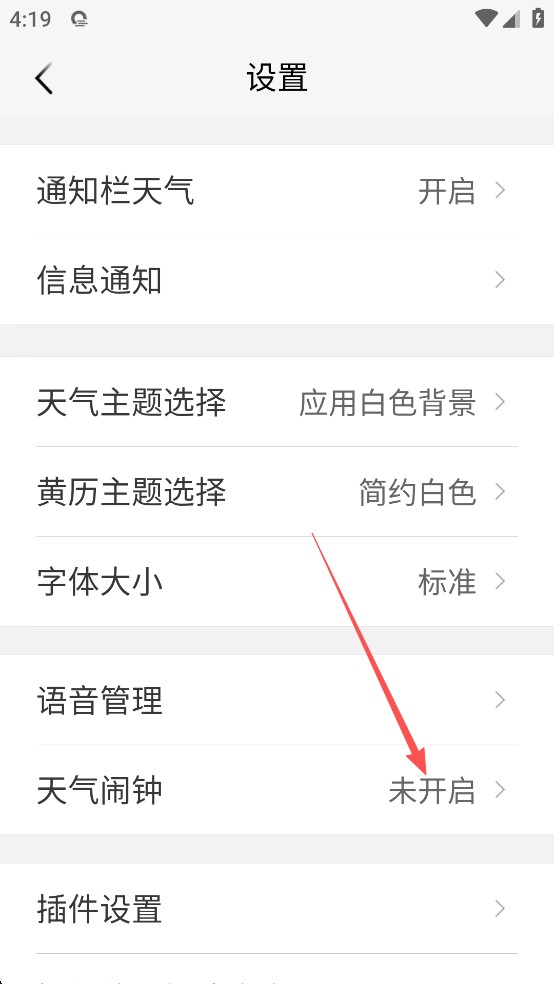 在服务页面中找到【设置】按钮 → 滑动页面找到【天气闹钟】选项 → 点击右侧开关开启。