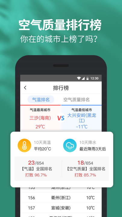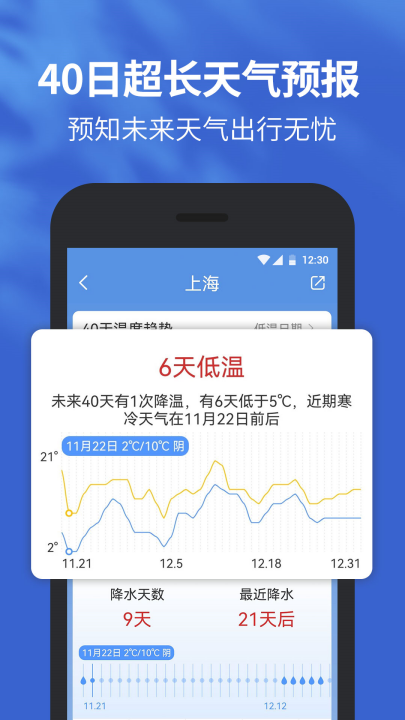 全新设计的天气首页,信息更有条理。基于中央气象台权威天气数据源,直观展现天气情况,阴天、晴天、下雨、刮风一目了然。突出当前温度,为当下出行提供参考,更有专利体感温度添减衣物更靠谱。点击首页当前温度即可进入全新设计的天气全维度,覆盖40日天气预报、体感、湿度、风向与风力、紫外线强度、气压和全面的天气指数。包含运动指数、健康指数、其他指数三大类近30项天气指数,更支持添加为特别关注的指数。