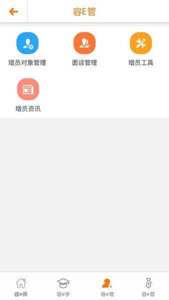 e合众是为客户打造的集成保险购买与保险服务的综合平台。主要围绕容e保为销售赋能,容e增为增员赋能,容e学为培训赋能,容e管为管理赋能四个方面进行队伍科技平台的搭建,搭建了容e保、容e增、容e学和容e管四大平台体系。