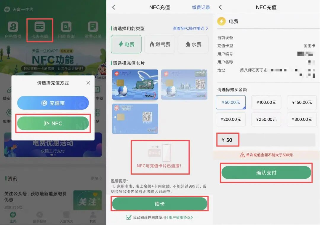 4、读卡成功后,会显示用户信息(户主名称、地址信息等),选择对应的充值金额支付,写卡成功系统会有提示充值成功或者到NFC充值页面右上角缴费记录查看。