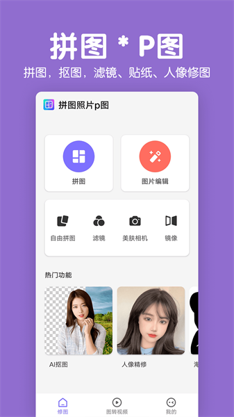 3.编辑模版:滤镜、海报、贴纸、抠图、镜像、人像精修