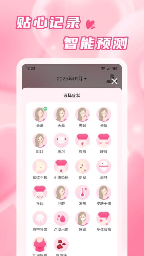 根据自己的姨妈经期来选择症状,一键进行症状的展示。