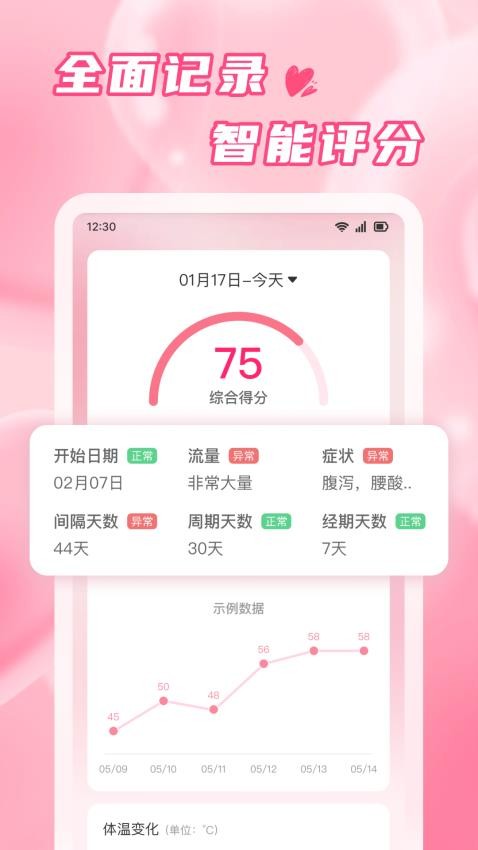 粉柚大姨妈app官网版是一款专为女性用户打造的经期管理软件,软件可以对用户的经期在线进行贴心守护,这里可以贴心记录自己的姨妈经期,选择经期症状来一键这哪是,方便用户可以轻松记录自己的月经变化,对月经持续的天数可以在线进行了解,轻松进行掌握。平台还支持用户可以在线添加身体的基本健康数据,能够在线进行全面记录,实现智能评分,帮助用户了解自身的健康。此外,粉柚大姨妈客户端也会对用户的周期数据进行统计分析,就可以在线智能预测自己的经期,一键管理,有需要的用户就赶紧来本站下载使用吧!
