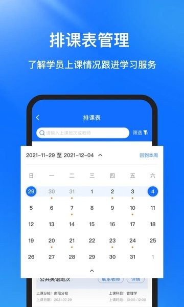● 排课表管理:班次的排课管理和各分校事业部、老师的排课情况查询和详情信息