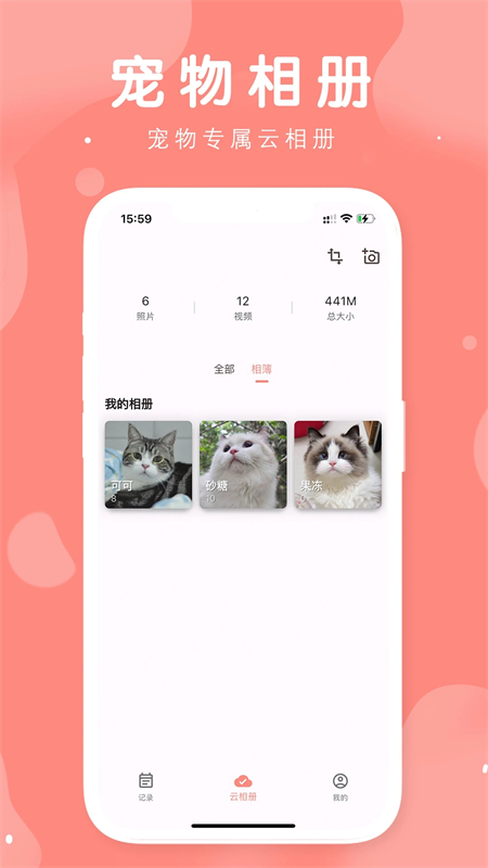 自动为每一只宠物建立一个专属云相册,可上传照片与视频,以时间线、年龄倒序的形式展现,长存精彩有趣的宠物瞬间。