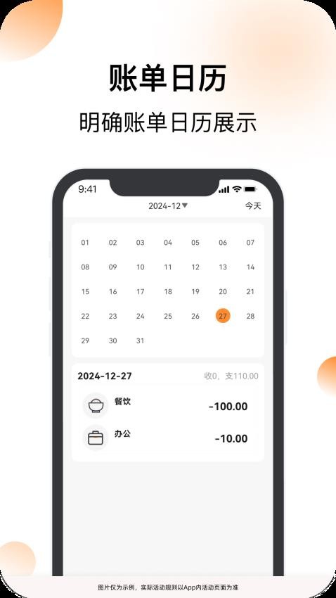 提供了账单日历,便于用户任意选择日期并查看当天的收支详情。