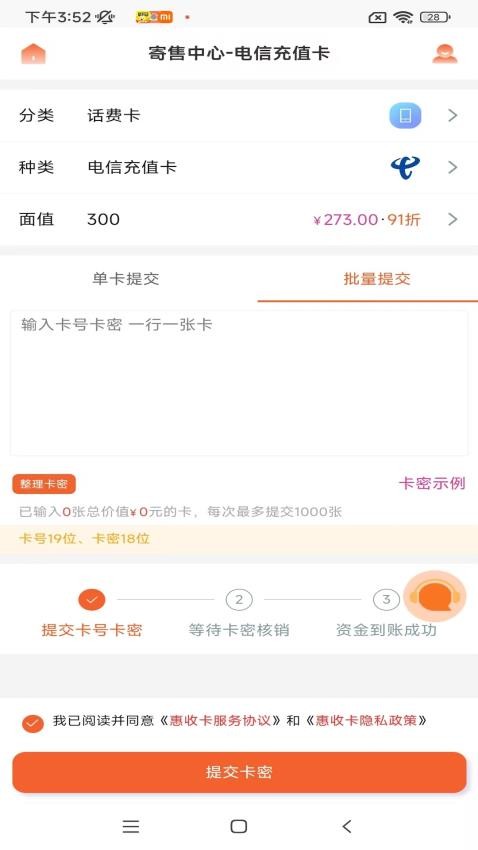 3、输入自己的卡号和卡密来一键提交,轻松实现卡券的寄售。