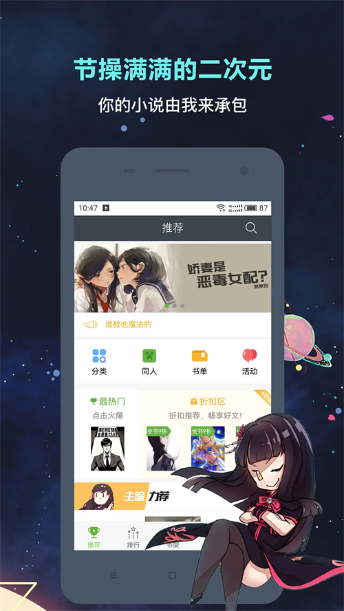 欢乐书客小说网手机版以宅文等二次元文学内容为主题,你可以在这里找到各种二次元热门作品,更有小说弹幕功能,边聊天边看小说,快乐更翻倍。