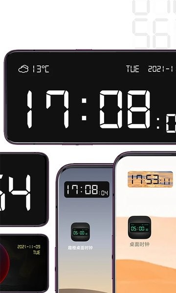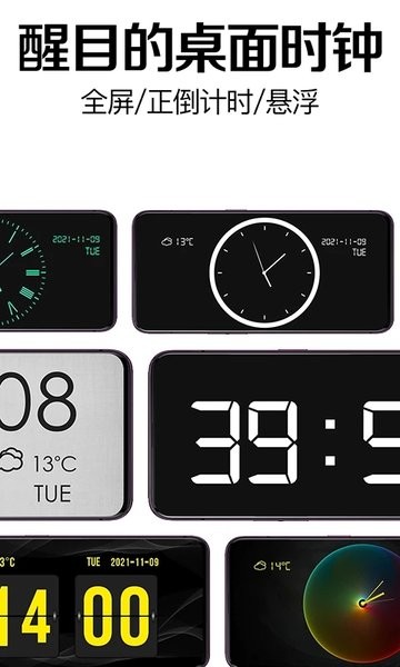 手机上多功能桌面时钟软件,拥有多种时钟主题可以在手机上切换设置使用,帮助用户可以查看各种精致的桌面时间和倒计时,使用方法简单,还可以设置闹钟时间,能够了解时间、日期和天气等内容,占手机内存少.