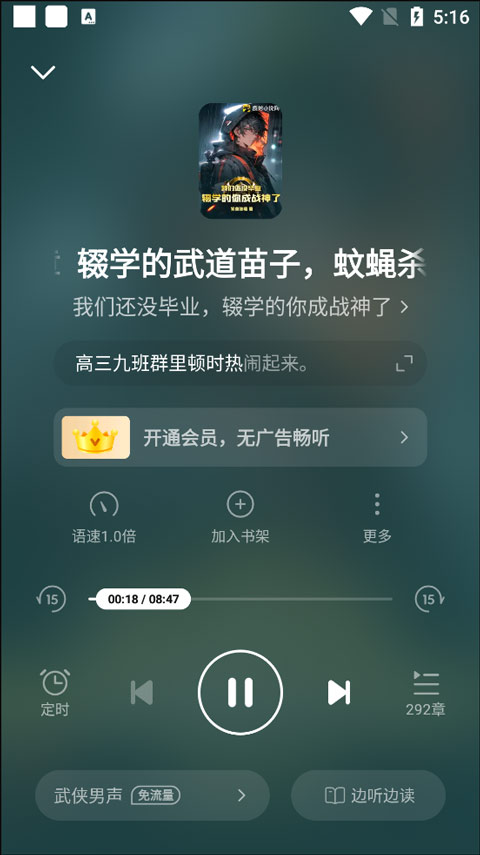 3.进入听书界面,这里可以任选一个章节听,还有给听书时间定时、调语速以及加入书架的功能