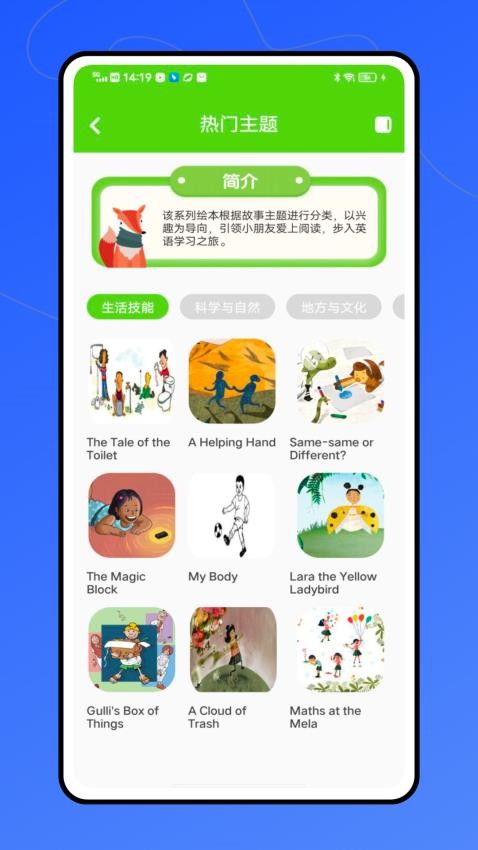 诸多英语学习主题,涵盖了生活、科学、地方和文化等主题资源,可任由用户学习;