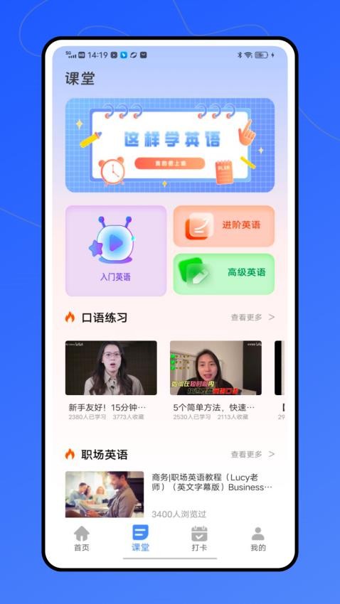 根据自己的英语掌握程度,可自行选择入门、进阶或高级英语进行学习提升;