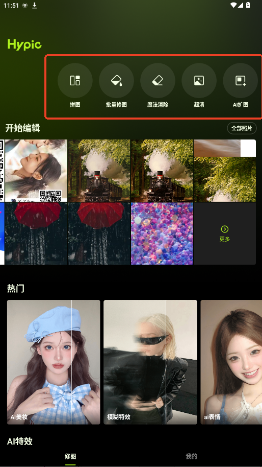 1.下载hypic点击打开,可以看到首页的功能布局,点击中间的【拼图】【批量修图】【我的项目】【消除笔】或是点击【+导入】进入修图页面