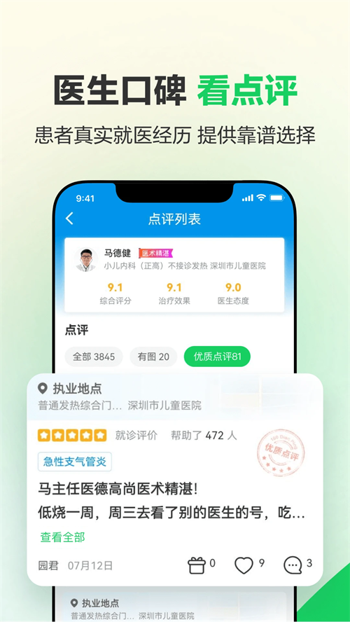平台合作医院超25000家,提供专业医疗服务,可预约号源超过200万;千万优质患者评价,帮助用户找到好医生;专病医生榜单推荐,提供专业医患匹配;