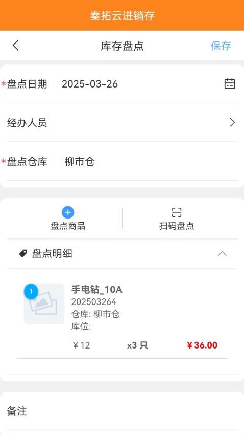 添加盘点商品选择盘点日期、盘点仓库、将商品的盘点情况详细记录下来保存管理。