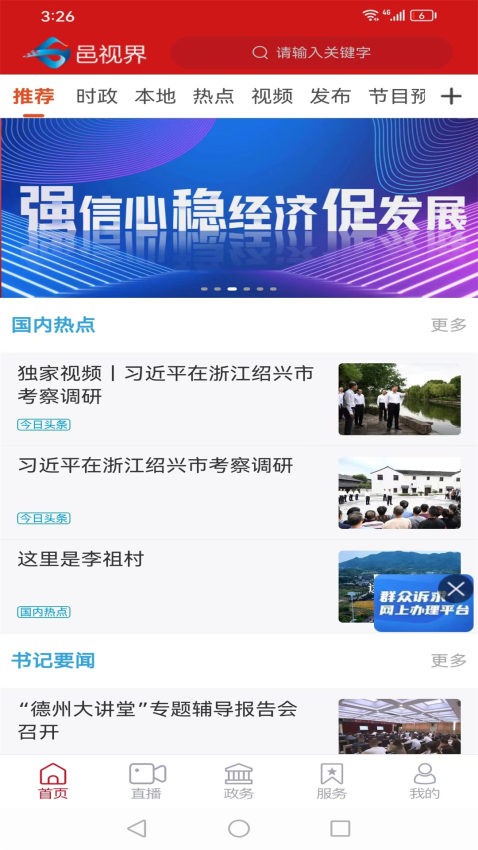 邑视界最新版是一款专为临邑县用户倾情打造的手机融媒app,里面汇集了最新最全的热点时事,便于用户一手掌握国家大小事,还能在线订阅自己感兴趣的话题,支持线上问政和参与相关党建活动等等!