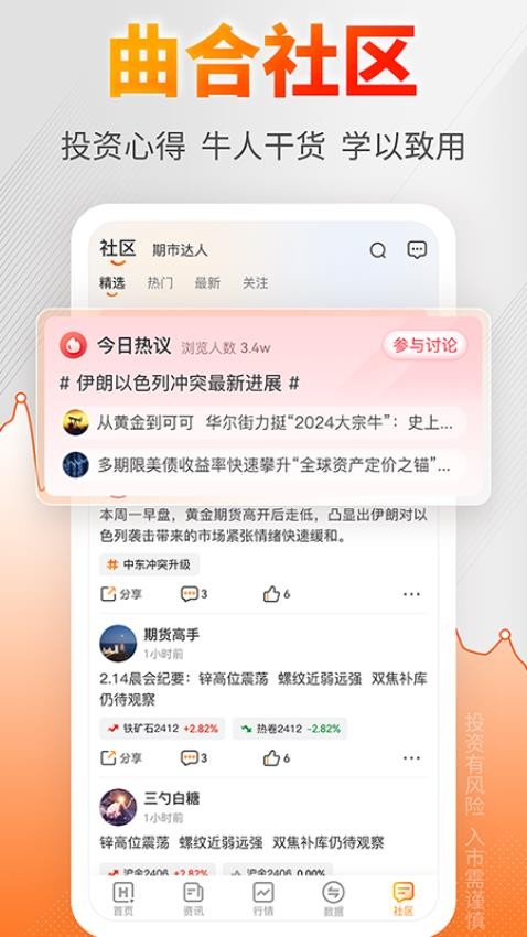 曲合app是一款专业提供期货数据信息的应用软件,里面为用户们提供了国内外很多期货的热点资讯、热门数据、技术指标以及期货机构研报观点等等,让用户可以通过软件便捷的掌握各样期货最新消息;用户在手机上安装这款软件后,即可随时在软件上查看了解自己感兴趣的期货信息数据,洞悉最新的市场动向,发现并把握市场良机。此外,曲合里面汇聚了很多期货大咖,打造了一个很好的期货交流社区,用户可以随时在社区里面和其他人进行各样期货投资分享交流。有需要的用户赶紧在本站下载这款软件体验吧!