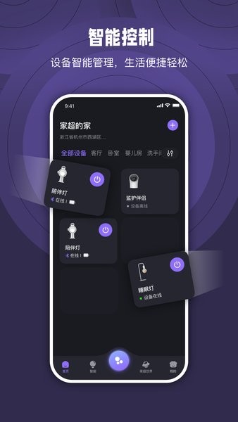 家超app最新版能够和智能家居产品配合使用,支持在手机上添加多个智能设备,包含了睡眠灯、陪伴灯、监控产品等,能够调节灯光的亮度颜色和模式,有超多白噪音可以选择,帮助用户安然入睡,还能进行定时哦!