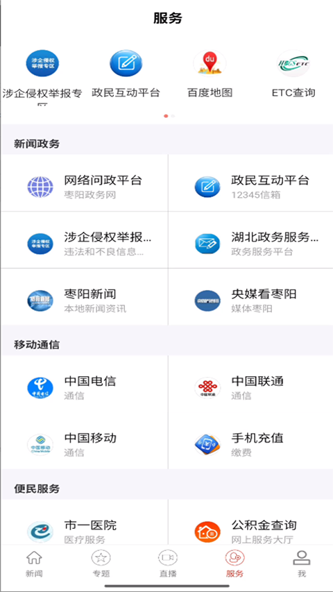 5. 便民服务种类丰富,有市一医院、公积金查询、文明实践、交通出行等多方面内容,如百度地图、代驾、ETC查询、违章查询等。